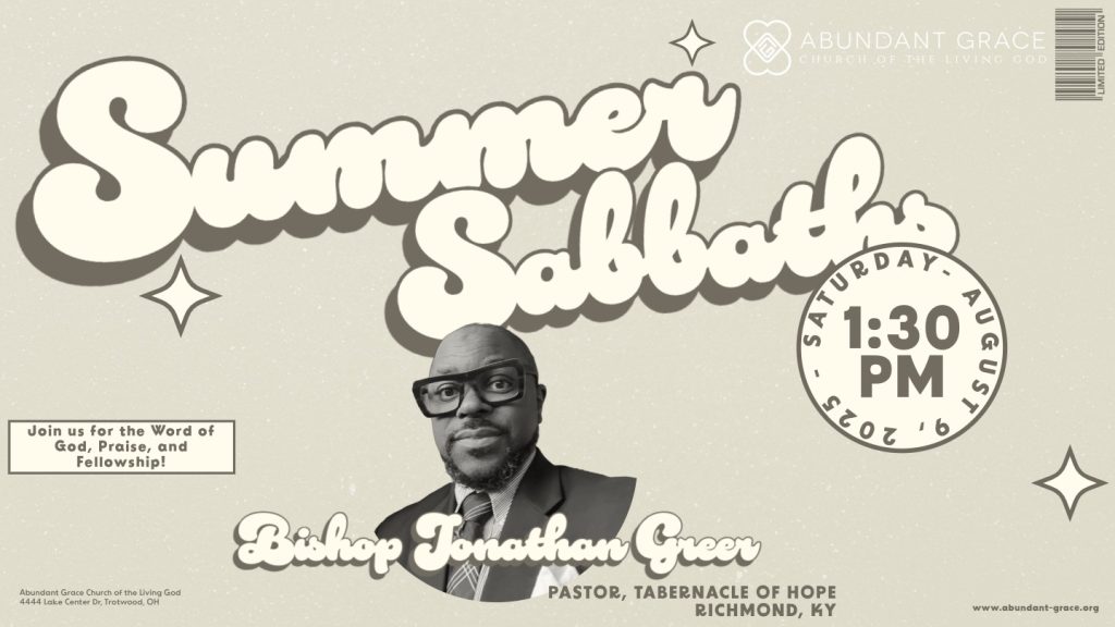 Join us on August 9, 2025, at 1:30pm, with our guest preacher, Bishop Jonathan Greer, pastor of the Tabernacle of Hope in Richmond, KY! The Scriptures & Tea (Sabbath School) lesson for this day, can be found below: