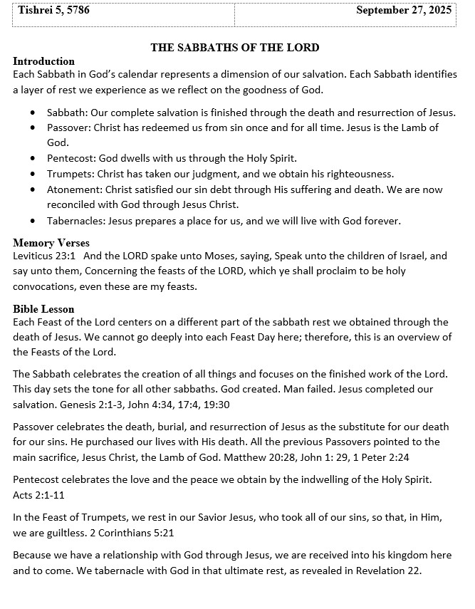 The outline for the Sabbath Day message on 09/27/25, “I’m Saved“, can be found at http://bible.com/events/49498392 . The Scriptures & Tea (Sabbath School) lesson for this day, can be found below:
